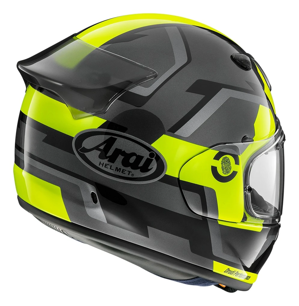 Comprehensive and controllable ventilation is based around 13 ventilation ports: 7 intake, 6 exhaust. The 3D Arai logo feeds cooling air into two central intake points and works well at low speed, alongside dual F1-derived tear duct top intakes, twin brow vents and 2-position sliding air-scoop, filtered chin vent. Hot air is efficiently extracted via the 3-way one-piece rear exhaust/spoiler, twin flush-fit side exhausts (with foam dams to reduce noise) and neck exhaust.