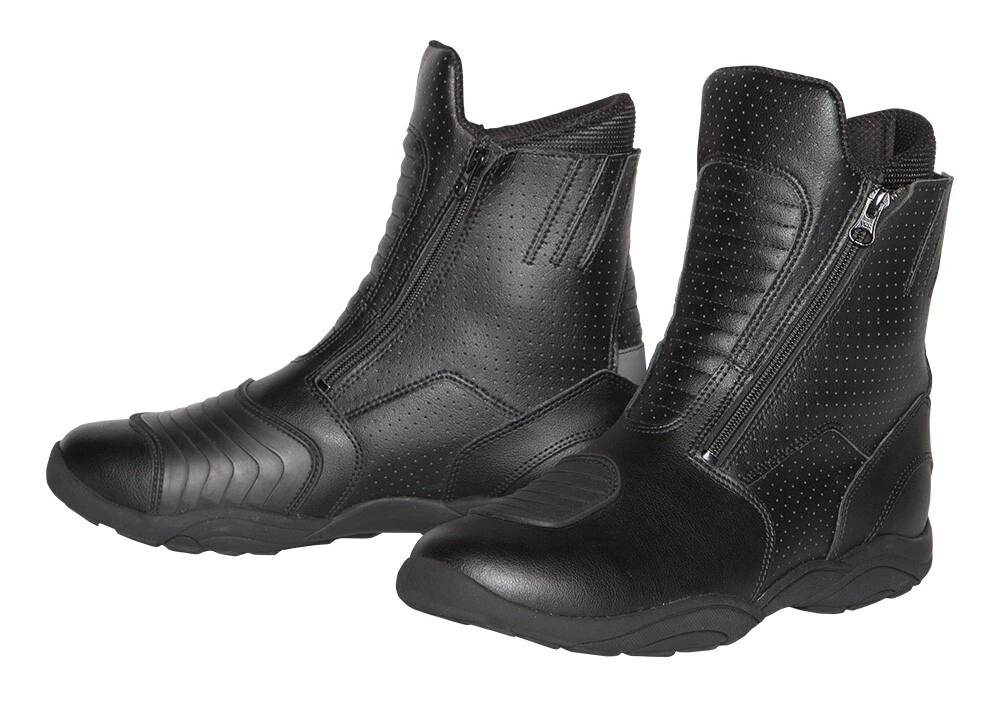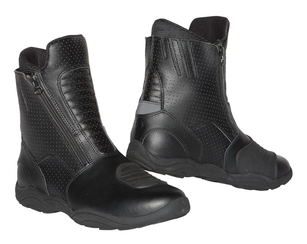 The BILT Pro Tourer Air Boots are a long distance touring boot that is ready for hot weather. The full cowhide construction is perforated and then fitted with a micro-mesh liner to wick moisture and facilitate airflow. A heavy duty sole is oil-resistant and packs a steel shank for durability, safety and cold morning kick-starts. Two YKK zippers run the length of the upper to make entry and exit a breeze. Stretch panels and zones of accordion flex provide the rider with a full range of motion on the bike while making the Pro Tourer Air Boots an equally capable companion when adventuring on foot.