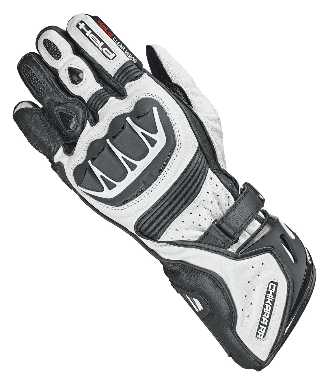 Race-ready, the Held Chikara Gloves have supple kangaroo leather on the palms and goatskin leather back of hand. These gloves are unlined, so the perforations at the wrist flow air, sending cooling air directly to your pulse points. SuperFabric reinforcements on the fingers and outside of the hand is slash- and abrasion-resistant. The double-closure cuff provides personalized adjustments to keep the Chikara RR Gloves safely on your hands in case of a get-off.