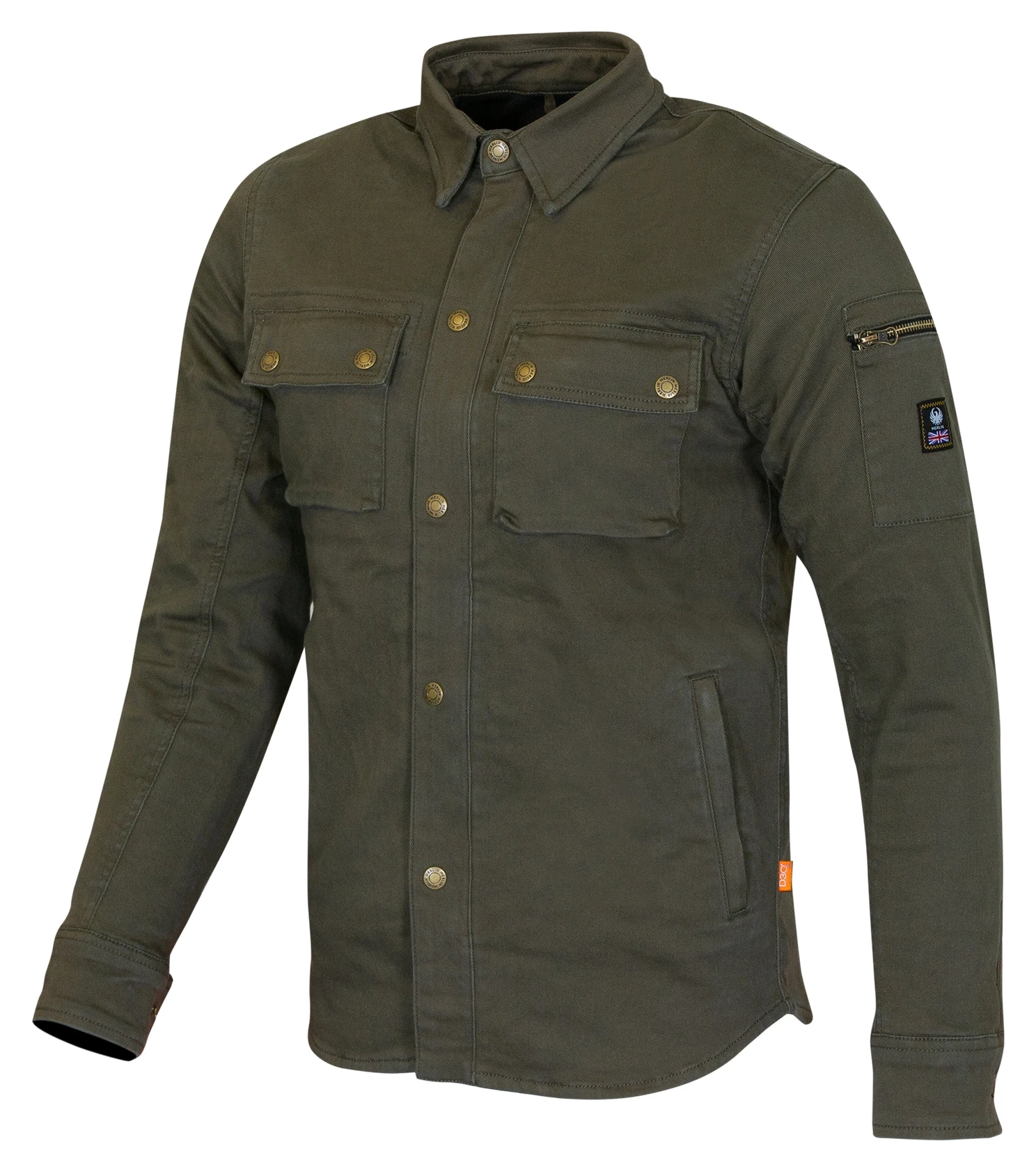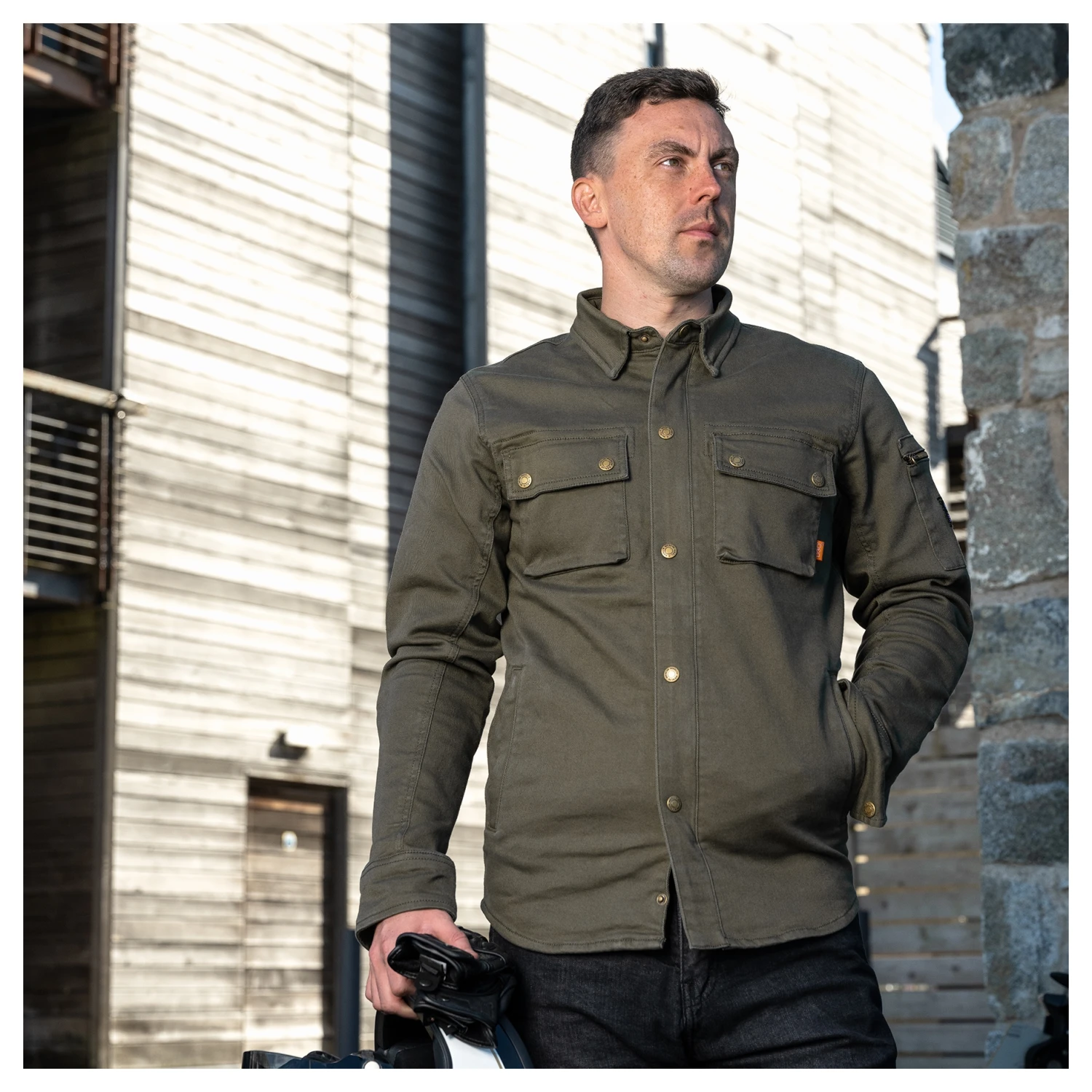 Ride in style without compromising on safety in the Brody Utility Riding Shirt. Designed to look like a classic utility shirt, the Brody is constructed using a single layer stretch cotton twill, backed up by D3O flexible Ghost armor in the shoulders and elbows. Finished with durable YKK zippers and Merlin-branded brass snap studs.