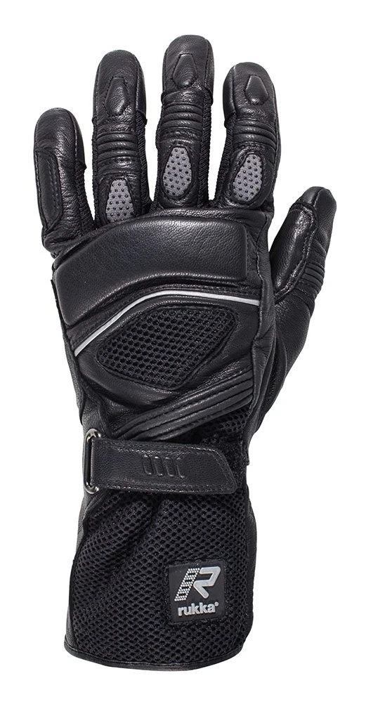 The Rukka AFTL gloves are designed to keep you protected during your hot weather rides. Leather provides abrasion resistance with key areas of ventilation from air stretch mesh and neoprene. A long cuff overlaps with your jacket to reduce the likelihood of exposing skin in a crash. Touchscreen fingertips let you operate your smartphone without removing your gloves.