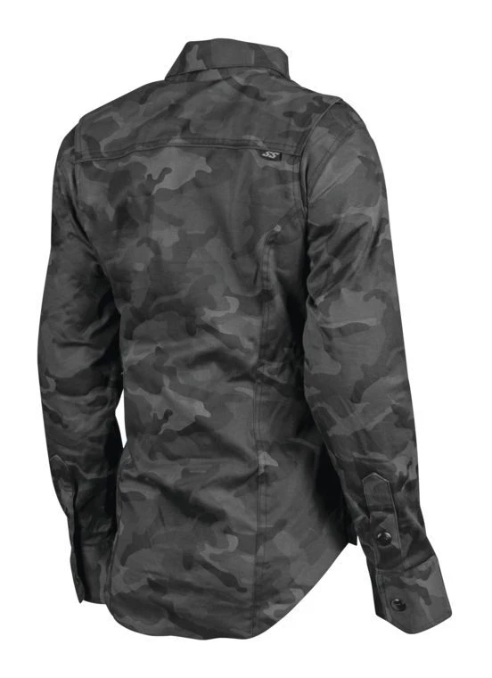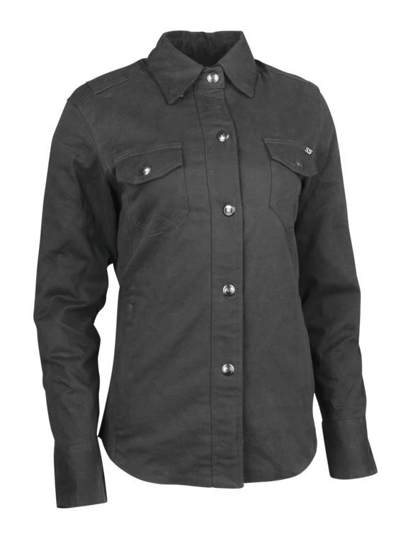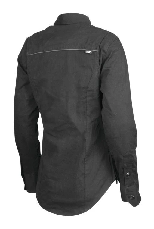 The Speed and Strength Speed Society Women’s Riding Shirt is a waxed cotton-polyester blend frame with 4-way stretch. Gusseted shoulders make an easy reach to high bars and clip-ons alike. At the collar, hidden snaps keep the collar controlled and prevent buffeting at high speed. A CE approved Vault back protector is included to match the Vault armor at the elbows and shoulders. Reflective trim across the width of the back panel aids visibility in low light conditions, and jacket to pants connection loops secure to your belt for even more secure motoring.