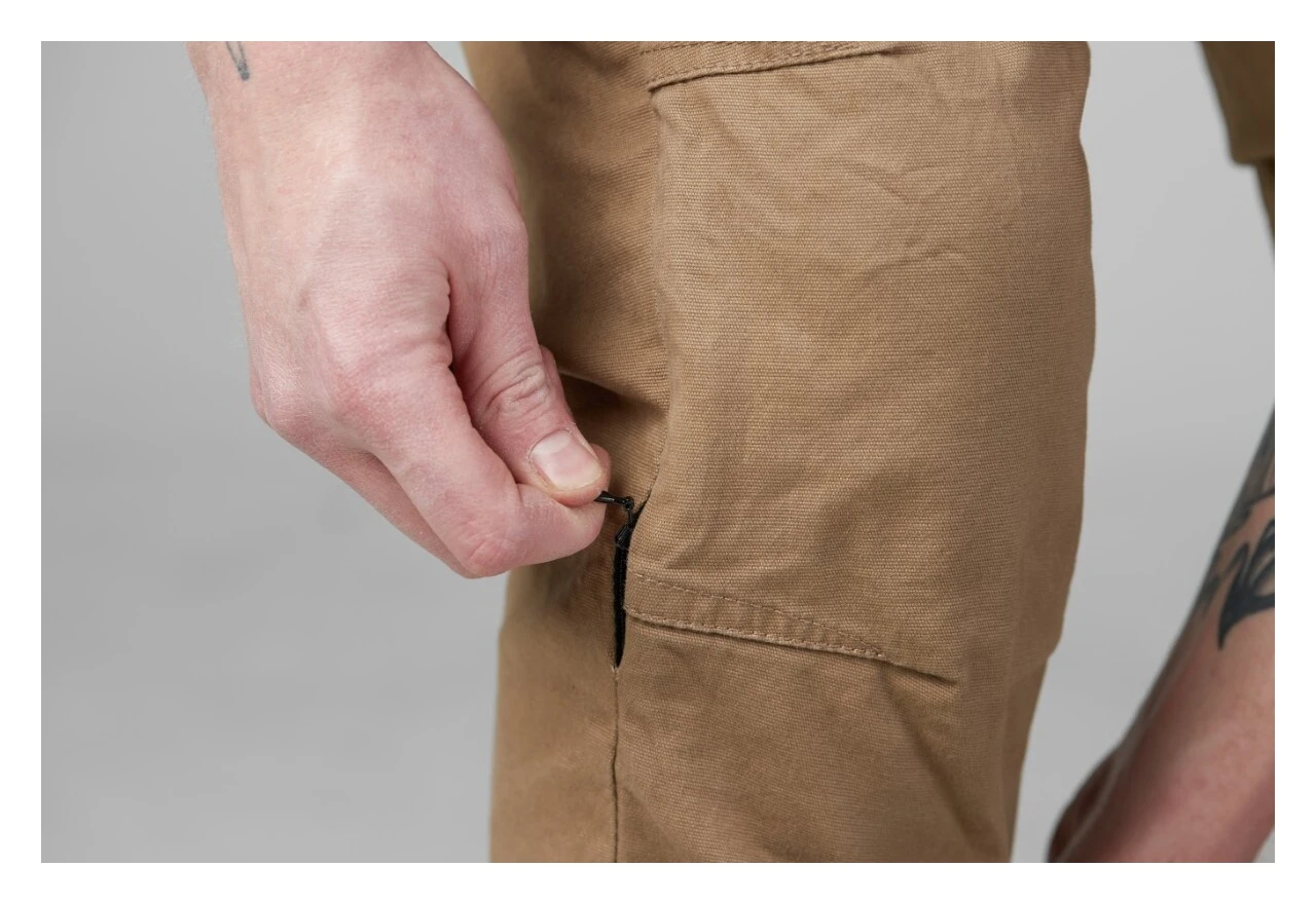 - 2 expandable cargo thigh pockets have hook-and-loop closure