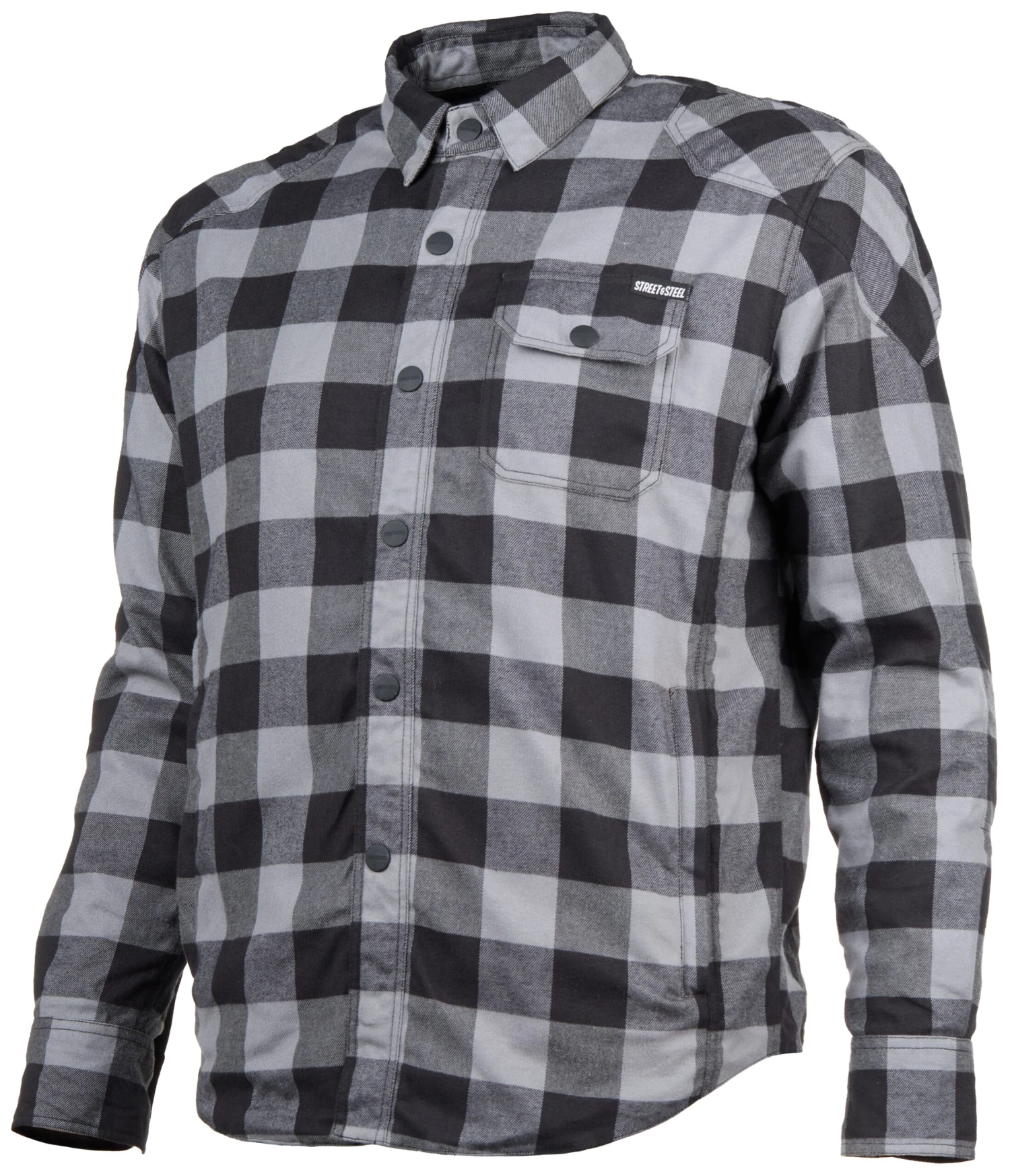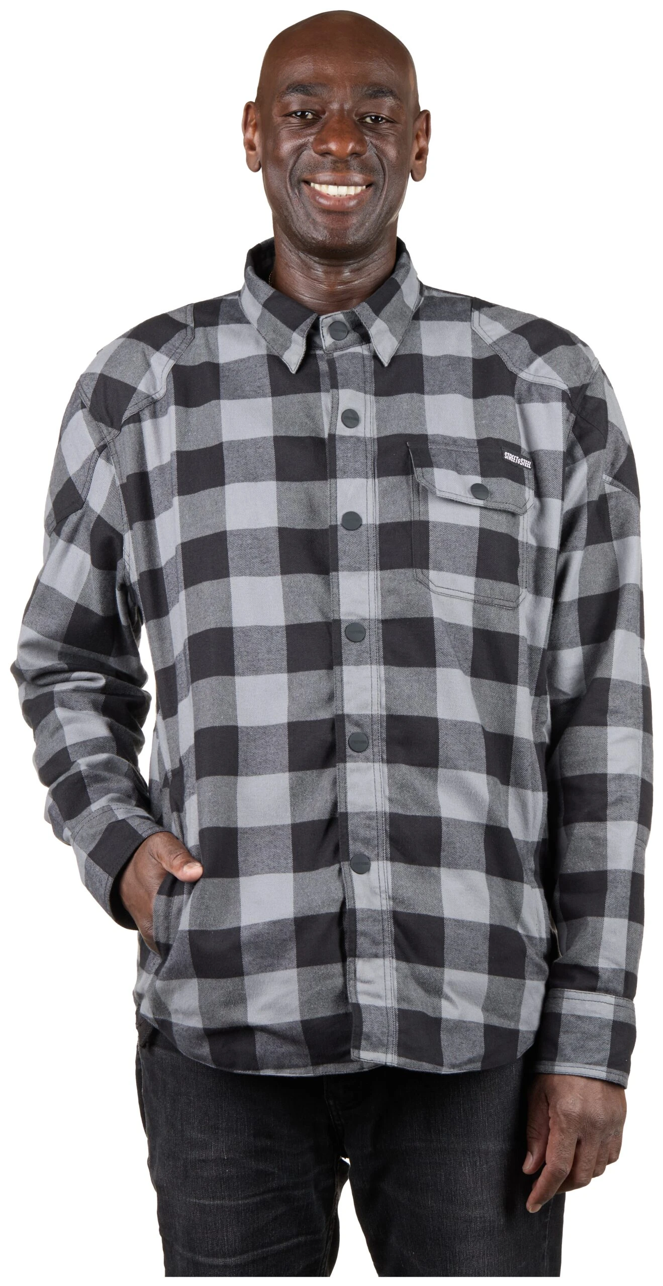 - YKK Center front zipper hidden behind rubberized Street & Steel snaps